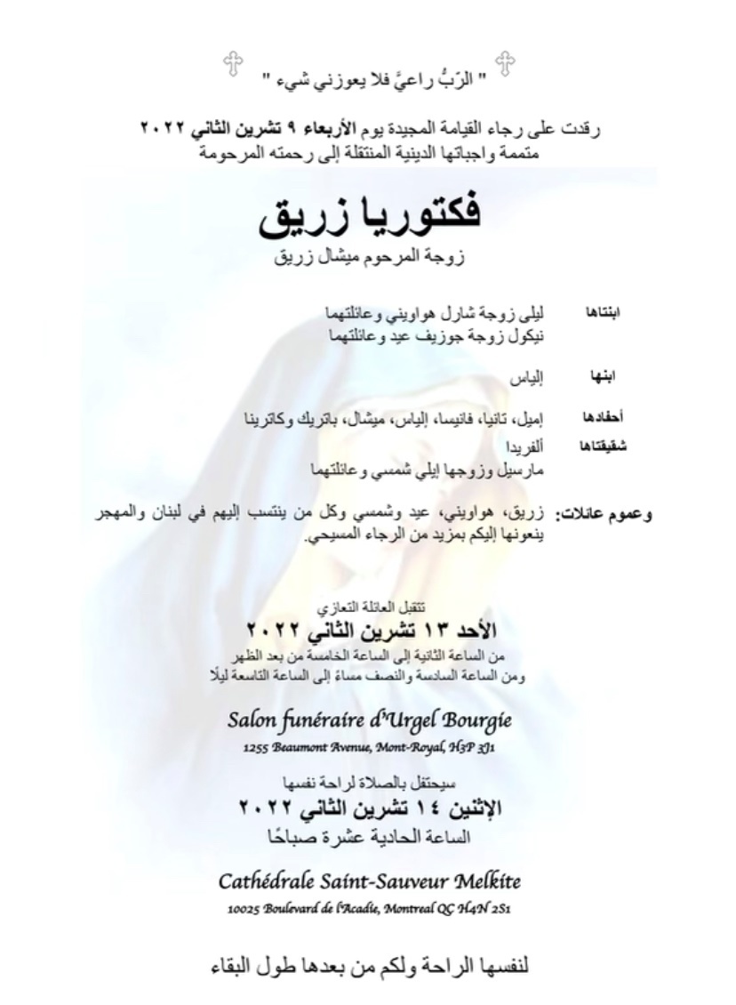Funeral service will be held on Monday November the 14th at 11 am at the Saint-Sauveur Melkite Cathedral situated at 10025 Acadie Boulevard, Montreal.