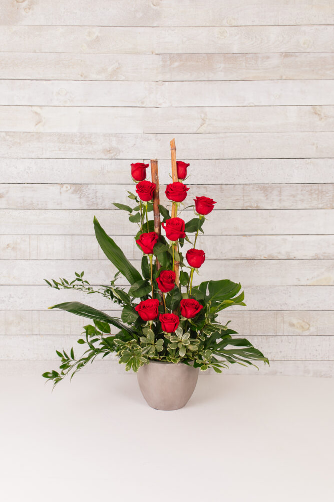 Express your deepest sympathies with this arrangement of red roses and carefully selected foliage.