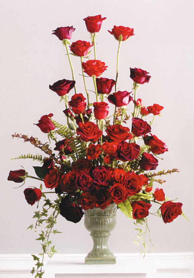 Arrangement of long stemmed Red roses in container.