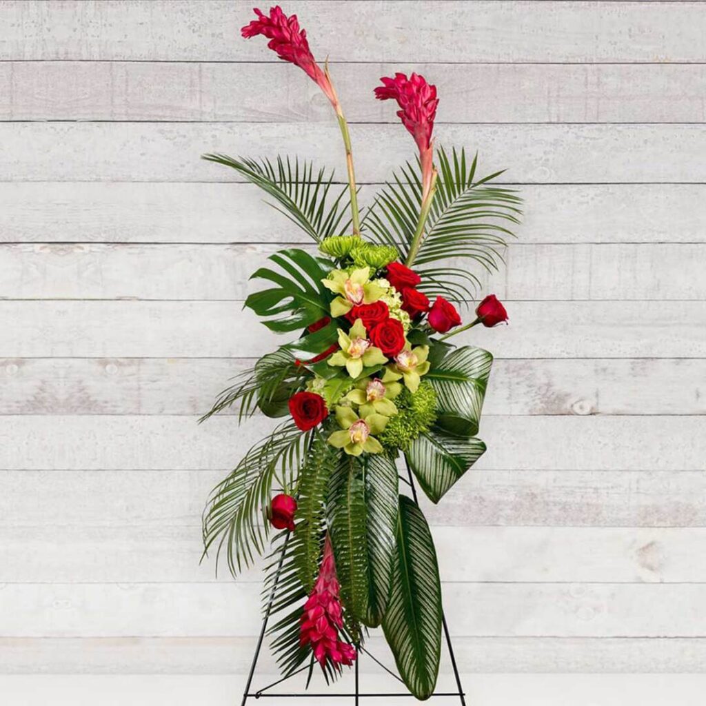 Composed of gingers, red roses, orchids and chrysanthemums, this majestic funeral spray will bring peace and serenity.