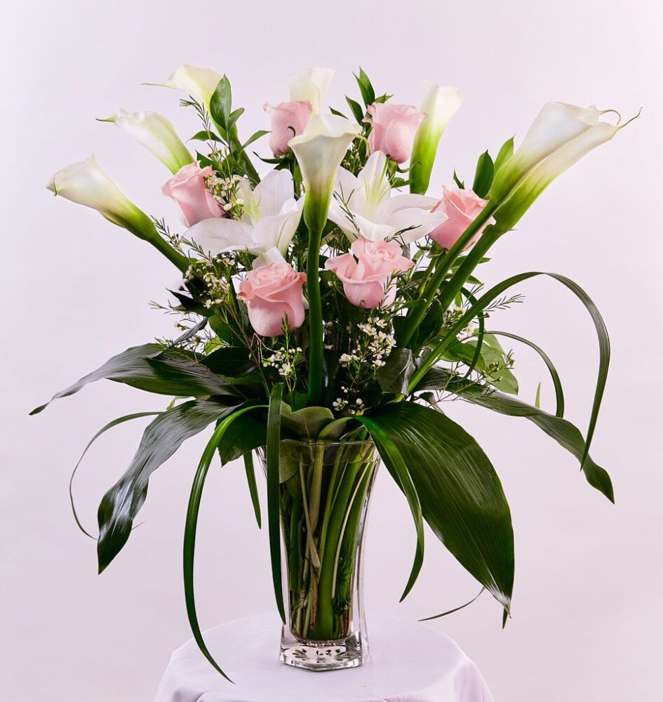 Lys cala, lys blanc, roses et assortiment de verdures.
